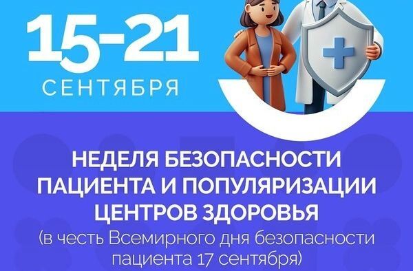 17 Сентября 2025 Неделя безопасности пациента и популяризации центров здоровья (в честь Всемирного дня безопасности пациента 17 сентября) - Функции центра здоровья: 1. Информирование населения о вредных и опасных для здоровья человека факторах; 2. Оценка функциональных и адаптивных резервов организма, прогноз состояния здоровья; 3. Формирование у граждан ответственного отношения к своему здоровью и здоровью своих близких; 4. Формирование у населения принципов «ответственного родительства»; 5. Обучение граждан, в том числе детей, гигиеническим навыкам и мотивирование их к отказу от вредных привычек, включающих помощь в отказе от потребления алкоголя и табака; 6. Обучение граждан эффективным методам профилактики заболеваний; 7. Консультирование по сохранению и укреплению здоровья, включая рекомендации по коррекции питания, двигательной активности, занятиям физкультурой и спортом, режиму сна, условиям быта, труда (учебы) и отдыха; 8. Разработка индивидуальных рекомендаций сохранения здоровья; 9. Организация в зоне своей ответственности, в том числе в сельской местности, мероприятий по формированию здорового образа жизни; 10. Мониторинг показателей в области профилактики неинфекционных заболеваний и формирования здорового образа жизни. 11. Категории граждан, которым оказываются медицинские услуги в центре здоровья: 1) впервые самостоятельно обратившиеся граждане для проведения комплексного обследования; 2) направленные врачами амбулаторно-поликлинических учреждений; 3) направленные врачами после дополнительной диспансеризации (I - II группы здоровья); 4) направленные врачами из стационаров после острого заболевания; 5) направленные работодателем по заключению врача, ответственного за проведение периодических медицинских осмотров и углубленных медицинских осмотров с I и II группами здоровья; 6) дети 15-17 лет, обратившиеся самостоятельно; 7) дети (с рождения до 17 лет), у которых решение о посещении Центра здоровья принято родителями (или другим законным представителем). По результатам обследования составляется индивидуальная программа формирования здорового образа жизни с оценкой факторов риска, функциональных и адаптивных резервов организма человека, с учетом его возрастных особенностей и рационального питания.